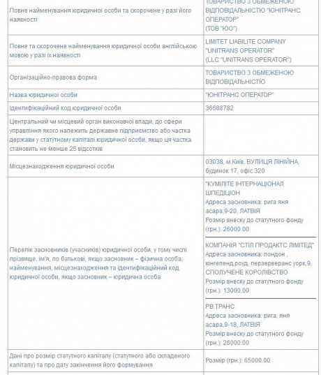 "Ця компанія у 2015 році виграла тендери на 342,55 млн грн. "Об’єднаної гірничо-хімічної компанії" на перевезення залізницею вантажів "Іршанського гірничо-збагачувального комбінату" та "Вільногірського гірничо-металургійного комбінату". У держреєстрі вказані засновник "Юнітранс Оператору" – латвійські компанії "Куміліте Інтернаціонал Шпедіціон" і "РВ Транс", а також "Стіл Продактс Лімітед" (Сполучене королівство)", - зазначає ЗМІ.