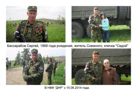 "Мешканець Сніжного, колишній співробітник Торезького міськвідділу міліції ГУМВС України в Донецькій області, кличка "Арсен". У незаконних збройних формуваннях з 11.05.2014 року. Також йдеться про Сергія Бессарабова, 1969 року народження - житель Сніжного, кличка "Сивий". У незаконних збройних формуваннях з 15.06.2014 року", - зазначив Аброськін.