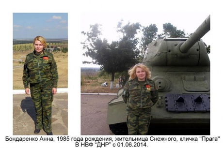Згадується у "нагородних листах" і Анна Бондаренко 1985 року народження, мешканка Сніжного, кличка "Прага", в незаконних збройних формуваннях з 01.06.2014.