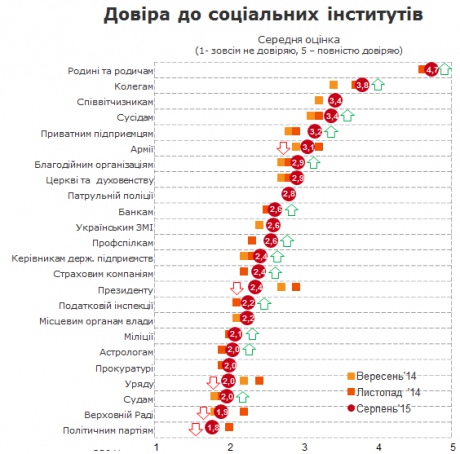 Автори дослідження зазначають, що, у порівнянні з даними листопада 2014 року, підвищився рівень довіри до ряду соціальних інститутів, у тому числі – до найближчого оточення, організацій (благодійні фонди, страхові компанії), силових структур (міліції, податкової інспекції, судів), а також до приватних підприємців, профспілок, керівників держпідприємств і астрологів.