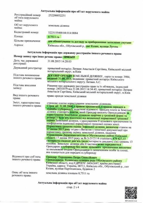 Згідно з документом, Порошенко може розпоряджатися цією ділянкою до 2064 року з правом подальшої пролонгації, а також може передавати його в суборенду третім особам без зміни цільового призначення.