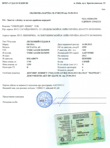 Також представники "Унікредит лізингу" показали скан документу про зняття Skoda з цими номерами з обліку, а також її техпаспорт з відрізаним кутиком.