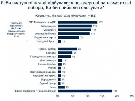 При цьому "Блок Петра Порошенка" набрав би 13% голосів, "Батьківщина", "Самопоміч" і "Опозиційний блок" – по 11%, Радикальна партія Ляшка – 7%, "Правий сектор" – 6%, "Свобода" – 5%.