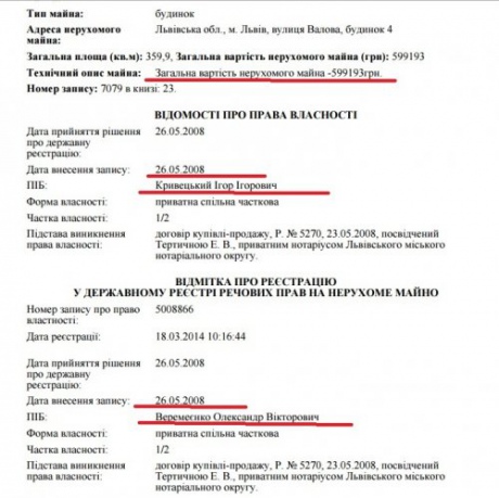 Згідно з даними держреєстру речових прав на нерухоме майно, Кривецький та Веремеєнко справді надали право управління майном члену партії "Свобода" Людмилі Височанській. Але право управляти майном спонсора партії вона отримала лише у 2012 році, через два роки після укладання угоди зі "Сбербанком Росії".