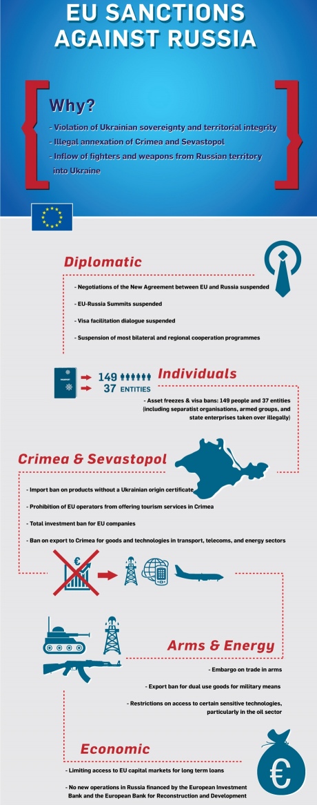 "Санкції ЄС проти Росії – чому? Порушення українського суверенітету і територіальної цілісності; нелегальна анексія Криму і Севастополя; проникнення бойовиків і зброї з російської території в Україну", - йдеться у матері в інфографіці.