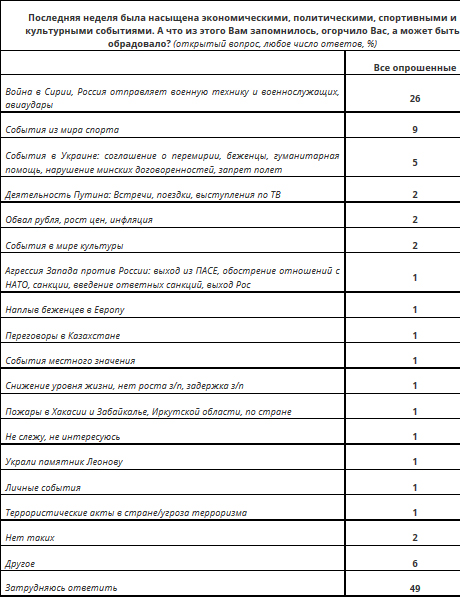За словами соціологічної служби, такий високий рівень схвалення роботи Путіна зафіксований, в першу чергу, у зв'язку з подіями в Сирії, авіаударами російської авіації по позиціях терористів (ці події назвали головними за минулий тиждень 26% респондентів).