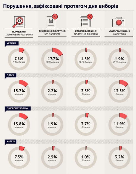 Фотографування бюлетенів зафіксували лише на 1,9% виборчих дільниць. В Одесі і Дніпропетровську такі зловживання мали місце на 13,5% і 11,9% виборчих дільниць відповідно, а у Харкові – на 3,2% виборчих дільниць.