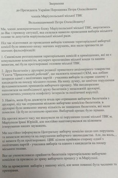 Десять з 16 членів Маріупольської міської ТВК просять президента Петра Порошенка не допустити фальсифікацій в Маріуполі.