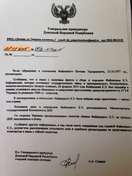 Заявник також передав прокуратурі офіційну відповідь так званого генерального прокурора "ДНР" Андрія Співака від 28 серпня 2015 року в якій зазначено, що Файницького заарештовано за "…проукраинскую, бендеровскую, националистическую позицию" і він начебто утримується під вартою.