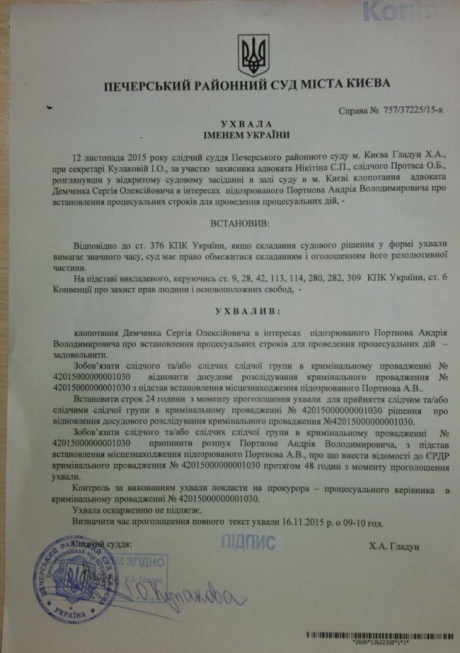 "Зобов'язати слідчого (…) припинити розшук Портнова Андрія Володимировича з підстав встановлення місцезнаходження підозрюваного Портнова А.В. (…) протягом 48 годин з моменту проголошення ухвали", – йдеться у документі.