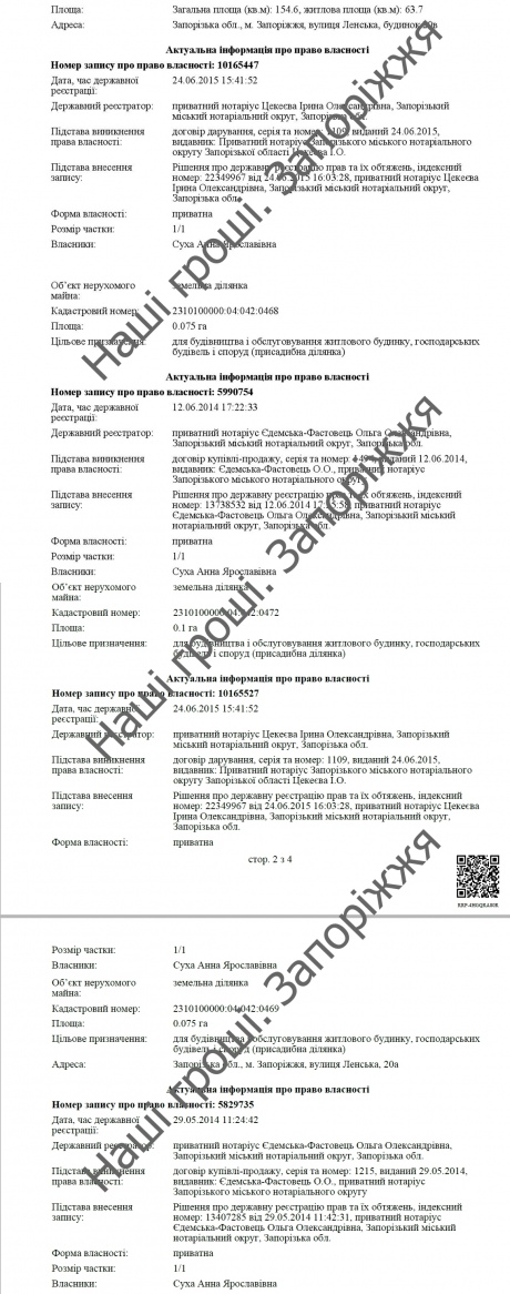 Також в червні 2015 року Анна Суха отримала у власність за договором дарування будинок загальною площею 155 кв. м., який розташовується на ділянках.