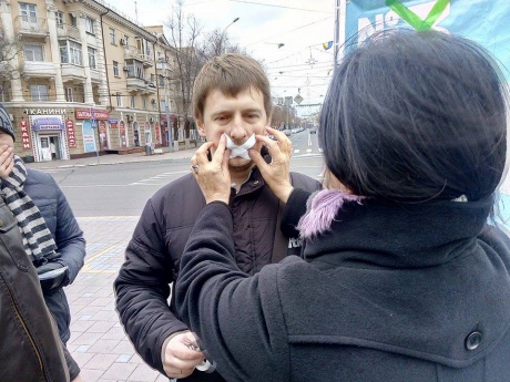 Як повідомляють Новости Донбасса, учасники акції роздавали листівки від КВУ із закликом взяти участь у виборах, а також провели опитування серед перехожих, чи згодні ті з забороною передвиборчої агітації.