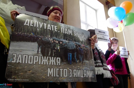 Активісти зустріли Буряка плакатами "Вимагаємо секретаря міськради від демократичних сил", "Ахметов геть!", "Обережно – регіонал" та "Депутате, пам’ятай: Запоріжжя – місто з яйцями!", нагадуючи про "яєчну неділю", коли запоріжці закидали групу проросійськи налаштованих активістів яйцями та борошном.