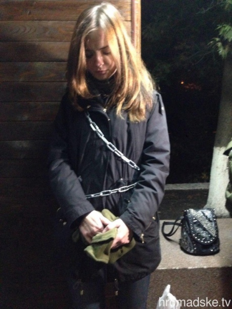 На знак протесту, дівчина Медведька прикула себе до дверей пункту.