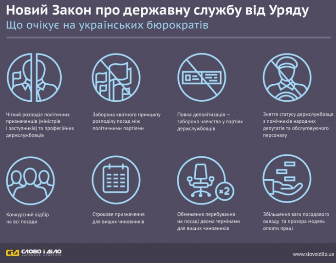 Верховна Рада прийняла закон про Державну службу, за яким державні службовці будуть призначатися за конкурсом, а можливість міністрів впливати на кадрову політику міністерства обмежується.