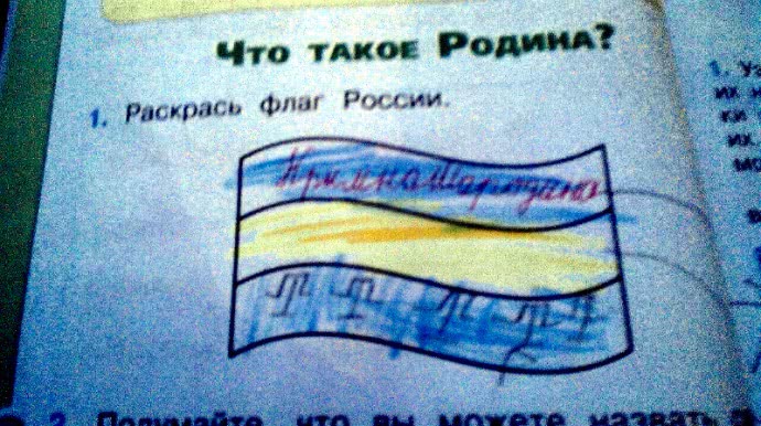 На уроці "Навколишній світ", виконуючи завдання "Розфарбуй прапор Росії" у розділі "Що таке Батьківщина?", учень замість триколора пофарбував шаблон в жовтий і блакитний кольори, кілька разів намалював тамгу (національний герб кримських татар) і зробив напис "Кримнашародіна".