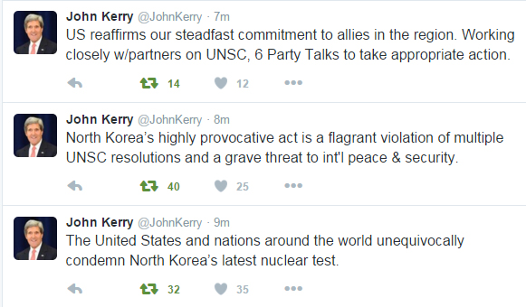Як згодом у Твіттері повідомив держсекретар США Джон Керрі, Сполучені Штати і країни світу "беззастережно засудити останні ядерні випробування Північної Кореї".