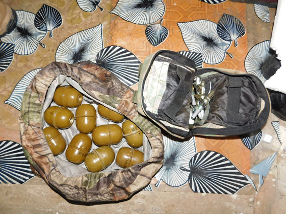 Під час оперативних заходів спільно з працівниками СБУ за місцем мешкання підозрюваного, у квартирі на поличці поліцейські виявили схованку з 11-ма гранатами РГД-5 та запалами до них.