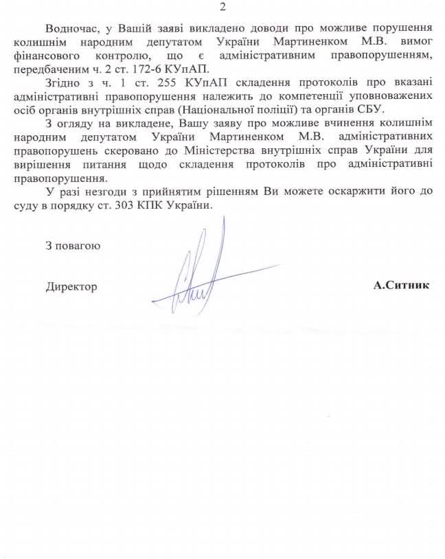 Проте у Антикорупційному бюро припустили, що могло мати місце "порушення колишнім народним депутатом Мартиненком М. В. вимог фінансового контролю, що є адміністративним правопорушенням".