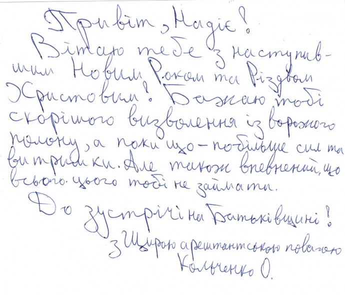 Кольченко ж у своєму листі Надії побажав "якнайшвидшого звільнення з ворожого полону".