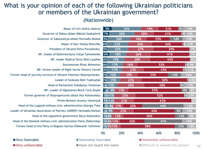 Особистими симпатіями українців найбільше користується мер Львова Андрій Садовий (загалом його підтримує 41% українців), далі – губернатор Одещини Михаїл Саакашвілі (35%), губернатор Закарпаття Геннадій Москаль (29%), мер Києва Віталій Кличко і президент Петро Порошенко (по 27%), лідер "Батьківщини" Юлія Тимошенко (24%), лідер "Радикальної партії" Олег Ляшко (23%), олігарх Рінат Ахметов і екс-лідер "Правого сектору" Дмитро Ярош (по 21%) та інші.