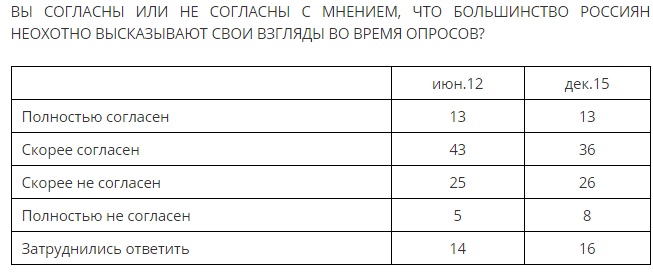 Цікаво, що більшість з опитаних росіян – 49% вважають, що інші побоюються відповідати щиро в соцопитуваннях. На питання "чому" 56% відповіли –"тому що побоюються негативних наслідків для себе".