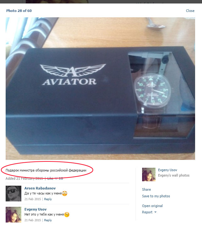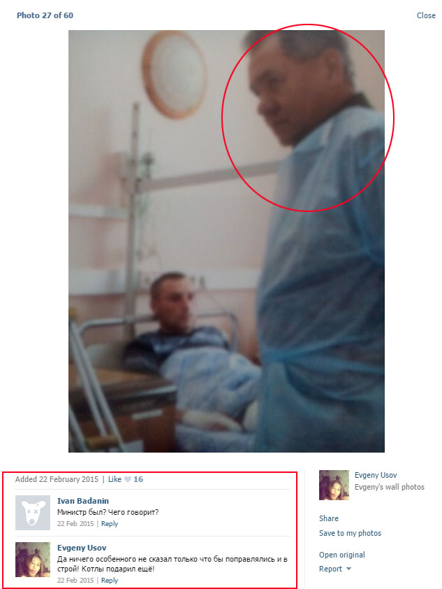 22 лютого, вже після виходу українських бійців з Дебальцевського плацдарма, Усов у своєму Вконтакте запостив фото зі шпиталю, на яокму міністр оборони вручає йому годинник із емблемою Міноборони РФ. Крім того, в одному з коментарів Усов підтвердив, що саме Шойгу подарував йому годинник. На кількох попередніх фото Усов зізнається, що лежить у шпиталі з осколковими пораненнями.