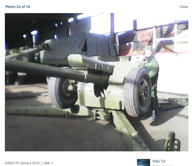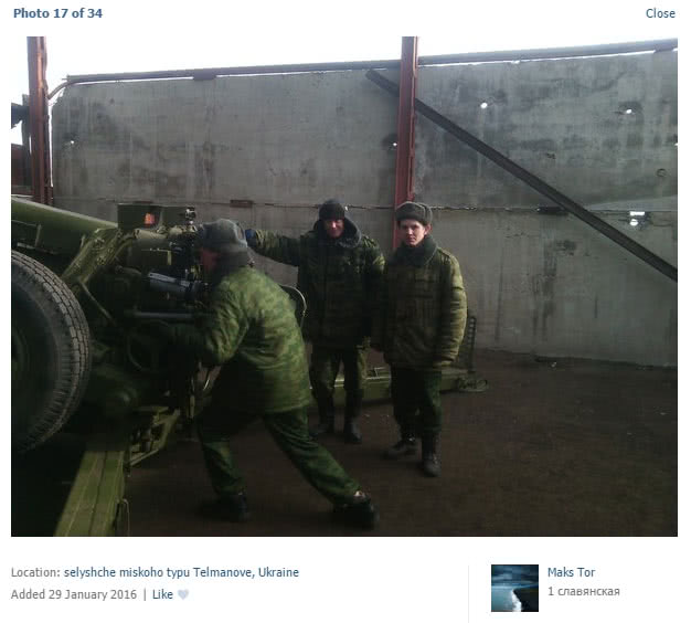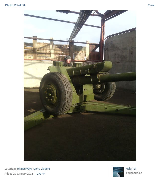 Бойовик з вигаданим ім'ям Maks Tor у соціальній мережі розмістив фото 122—мм гаубиць Д-30А, крім того, він поставив геолокація, яка свідчить, що ця зброя знаходиться в Тельмановьскому районі – в 12 км від лінії розмежування.