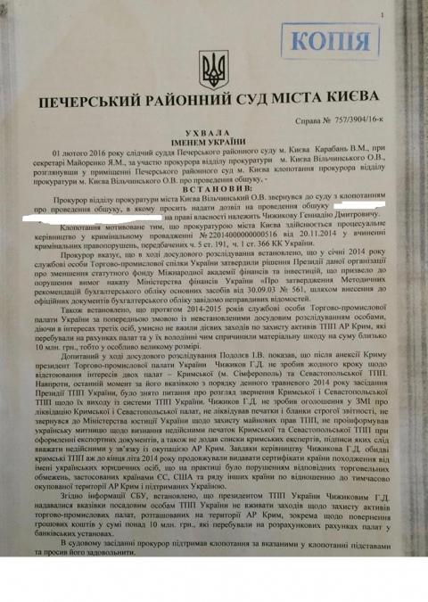 Як сказано в ухвалі Печерського суду, який дав дозвіл на обшук, Чижикову закидають те, що він не захистив майно ТПП у Криму. Ухвала є у розпорядженні УП.