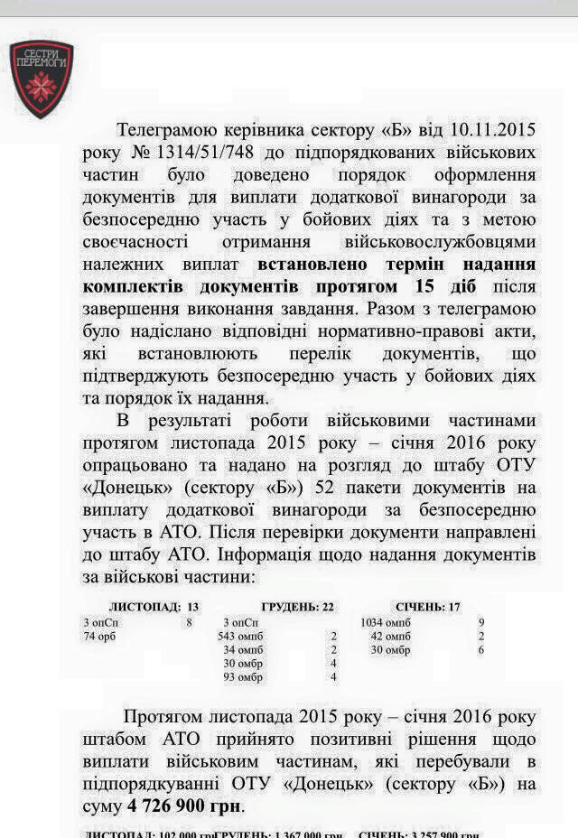 Також у телеграмі зазначено що за листопад / грудень / січень усім підрозділам "Сектора Б" було виплачено понад 4,7 млн. грн., "що рівнозначно 4 тисячам людей, які воювали по одному дню за рік дії даної постанови".