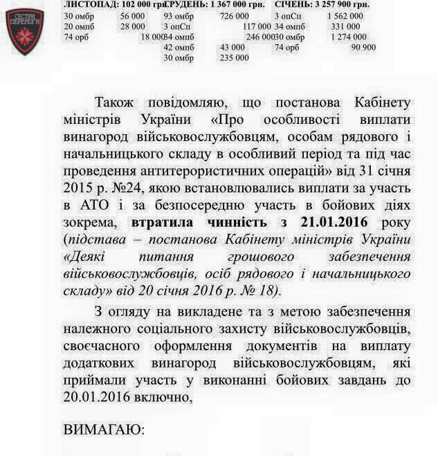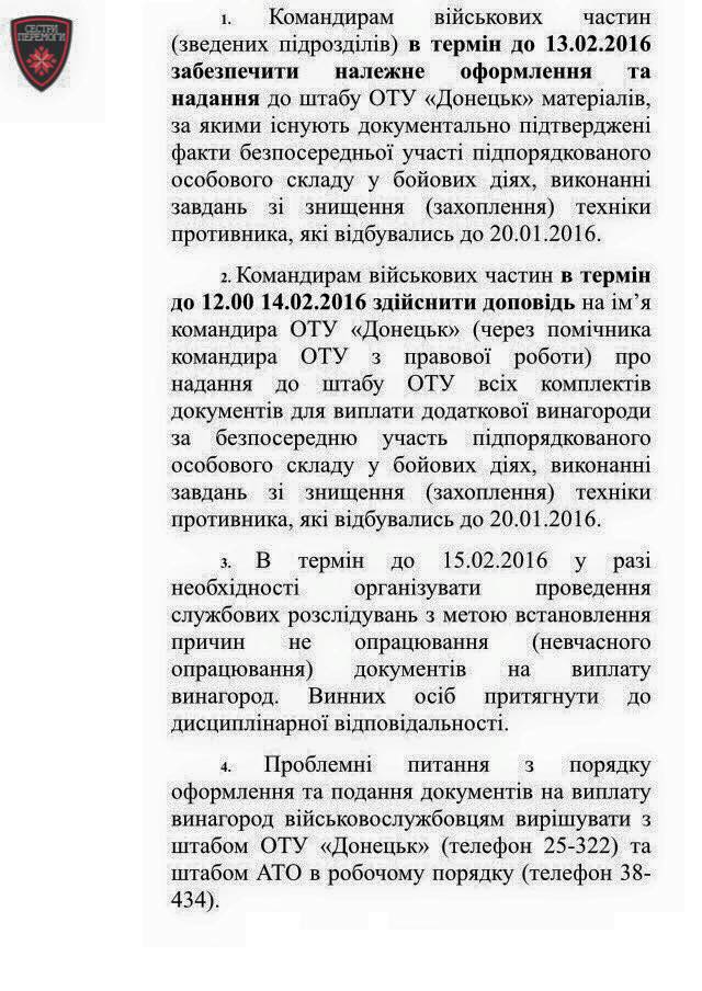 "10 лютого у всі військові частини "Сектора Б" прийшла телеграма, в якій зазначено, що постанову КМУ про бойові виплати в розмірі 1 тис. грн. на людину за кожен день бойових дій, прийняту у січні 2015 року, скасовано з 20 лютого 2016 року. Усі документи (на виплати) мали бути подані до 13 лютого", - зазначає Губський.