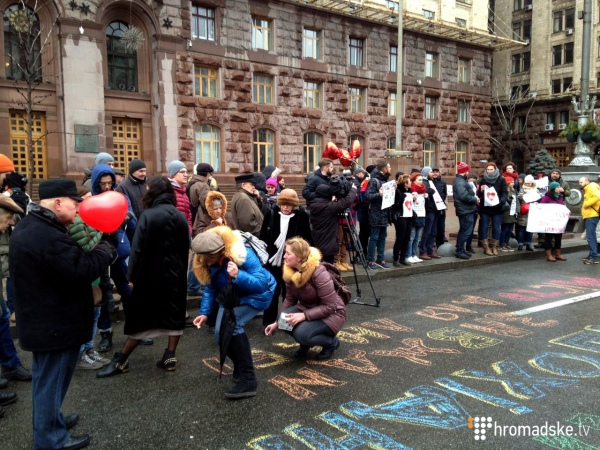 У Києві на Хрещатику влаштували акцію "Закохані у Київ": активісти вимагали скасувати рішення про відкриття вулиці Хрещатик для руху автотранспорту безстроково і без обмежень у вихідні дні.