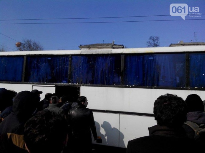 У Запоріжжі закидали яйцями автобуси з учасниками акції проти повалення пам'ятника Леніну, учасників облили зеленкою.
