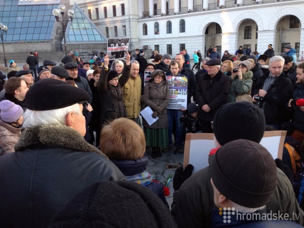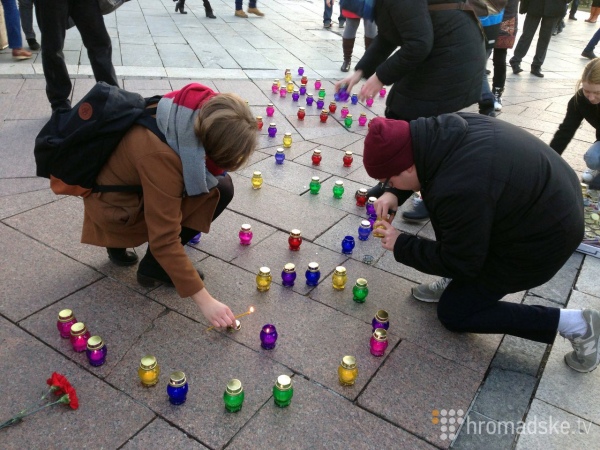 Кияни прийшли під стелу Незалежності з квітами та лампадками, деякі принесли плакати, на яких написані заклики припинити політичні репресії в Російській Федерації.