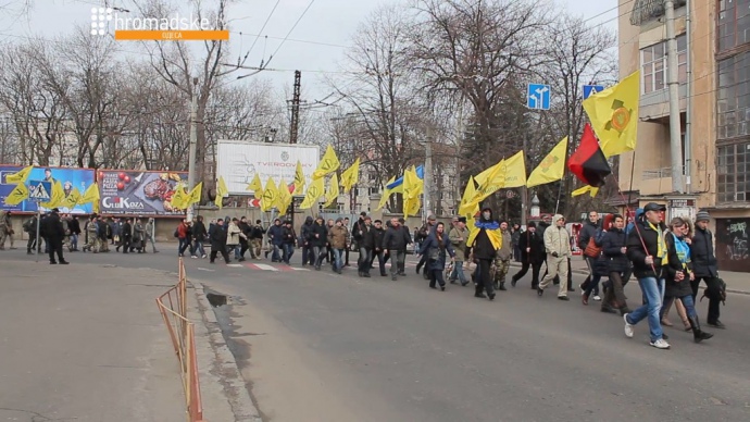 Під час ходи лунали гасла "Україна понад усе", "Слава Україні - героям слава". У учасників акції були прапори України, "Вільних людей" та "Правого сектору".