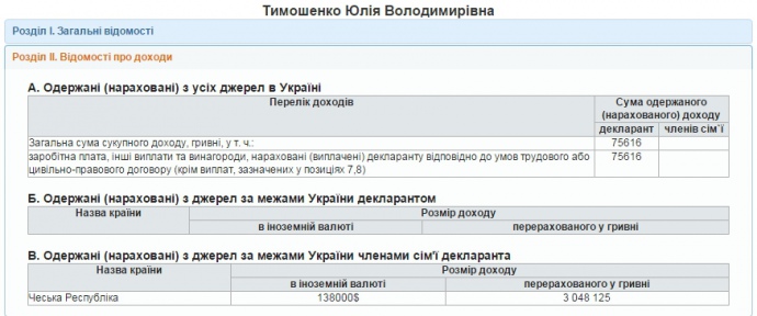 Однак чоловік Тимошенко Олександр отримав 138 тисяч доларів (3,05 мільйона гривень) доходів у Чехії.