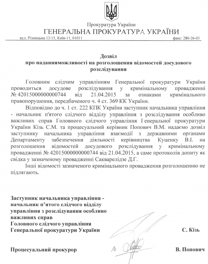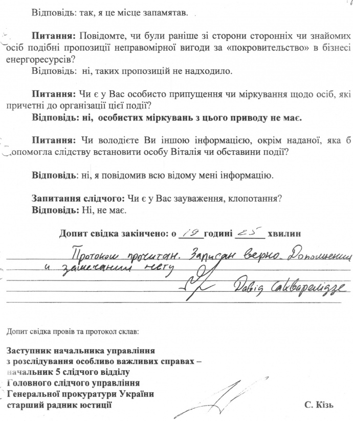 Пізніше на сайті ГПУ був оприлюднений витяг з протоколу допиту Сакварелідзе.