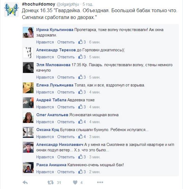 Відзначається, що вибухову хвилю також відчули жителі Ясинуватої, Авдіївки, Червоного Пахаря і Горлівки.