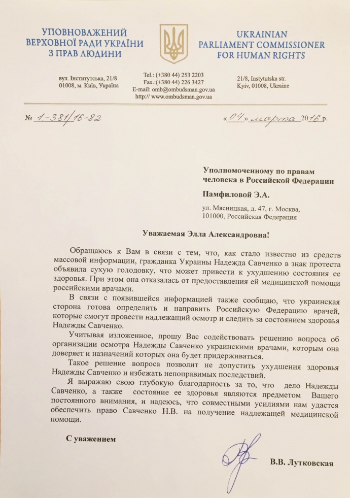 "Українська сторона готова визначити і направити в Російську Федерацію лікарів, які зможуть провести належний огляд і стежити за станом здоров’я Надії Савченко. Прошу вас сприяти вирішенню питання про організацію огляду Надії Савченко українськими лікарями, яким вона довіряє і призначень яких вона буде дотримуватися", – йдеться у листі омбудсмана.