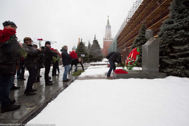 "Вранці.... незважаючи на мокрий сніг, москвичі стягувалися до Червоної площі. 63 роки тому помер Сталін і на честь цієї дати вже кілька років проводиться акція під назвою "Дві гвоздики для товариша Сталіна. Якщо раніше поклонятися Сталіну йшли ортодоксальні комуністи та інші радикали, то сьогодні більшу частину тих, хто прийшов, становлять люди, які називають себе патріотами і державниками", - написав він.