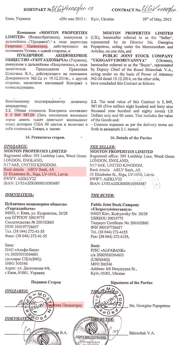 Як виявилося, "УкрГазВидобування" збиралося купити "колтюбінг" у фірми Moston Properties Limited, яка прописана у Лондоні в будинку №393 на вулиці Lordship Lane. Угода була укладена 29 травня 2015 року на суму 5 мільйонів 850 тисяч доларів.