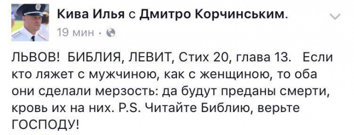 Голова департаменту протидії наркозлочинності Національної поліції Ілля Кива опублікував на своїй сторінці у Facebook уривок зі Старого завіту, який закликає карати гомосексуалістів смертю.
