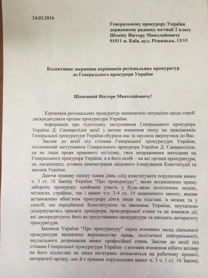 Керівники більшості обласних прокуратур підписали колективний лист до генпрокурора Віктора Шокіна, у якому висловили йому свою підтримку в конфлікті з прокурором Одеської області і заступником Шокіна Давидом Сакварелідзе.