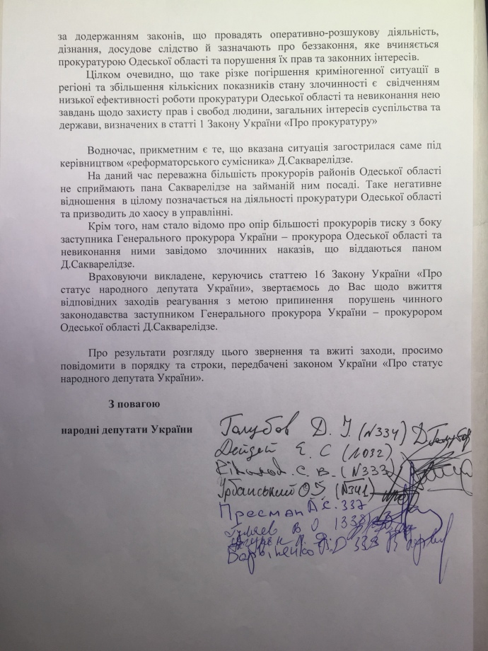 "Маємо зауважити, що обіймаючи посаду прокурора Одеської області протягом півроку, Сакварелідзе нічого не зробив для зміцнення законності та правопорядку в області, розкриттю та розслідуванню злочинів... Усе прокурорське надбання Сакварелідзе – імпорт в область популізму, обману та артистизму", - йдеться у листі.