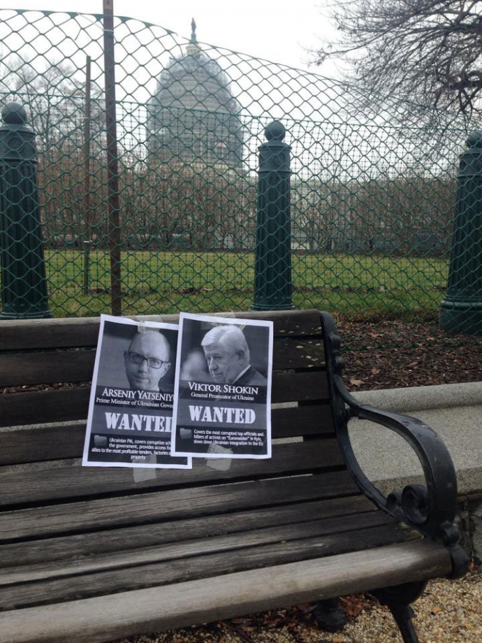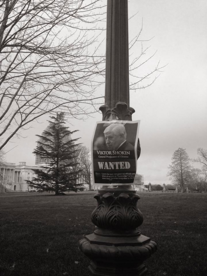 Водночас у США, куди цього тижня має приїхати президент Петро Порошенко, активісти також розклеїли заклики про відставку Генпрокурора та прем'єра Арсенія Яценюка. Фото розміщені неподалік будівлі Конгресу США.