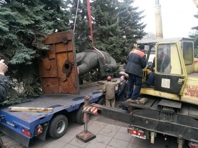 Монумент був знесений з постаменту разом з плитою, на якій стояв. Причому, як повідомляє кореспондент 0629, демонтаж проходив під потрійною охороною. До журналіста кілька разів підходили з питанням і цікавилися, що він робить на території комбінату.