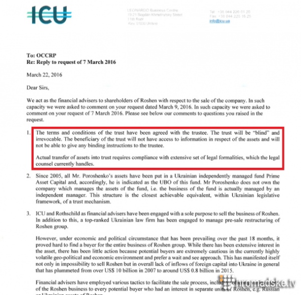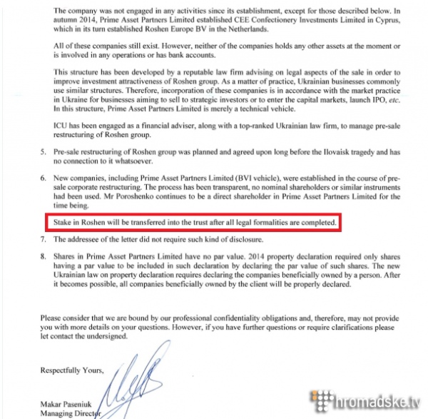 Зокрема, у листі від 22 березня, підписаному паном Пасенюком, йдеться наступне: "Умови трасту були погоджені з довірчим управителем. Траст буде "сліпим" та безвідкличним. Фактична передача активів у траст вимагає дотримання значної кількості юридичних формальностей. На даний момент юридичний радник забезпечує дотримання таких формальностей".