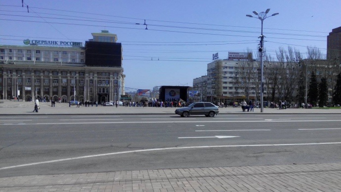 Про це пишуть "Новости Донбасса". На площі невелика кількість людей, встановили агітаційні намети, де роздають газети "Донецька республіка".