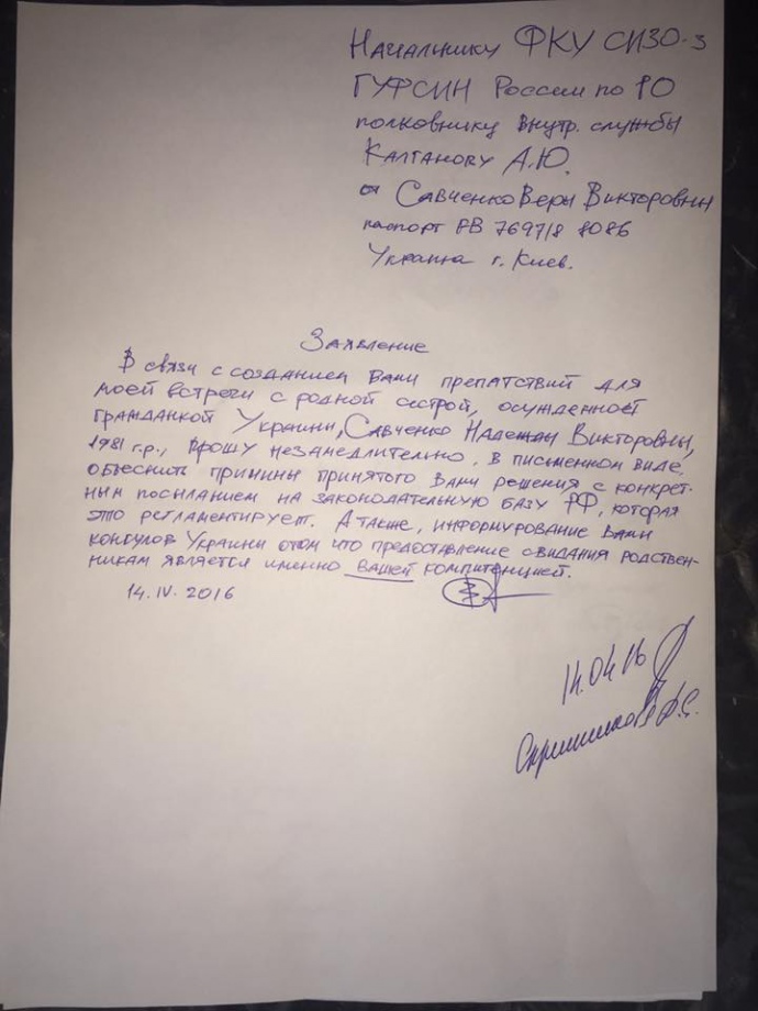 "Після більш ніж п'яти годин очікування мене пропустили в СІЗО. Сестру Надії Віру сьогодні так і не пустили. Весь день Надію накачували внутрішньовенними вливаннями. Вона показала руки - всі поколоті, живих вен немає. Лікарі шукали вени навіть на ногах", - написав він .