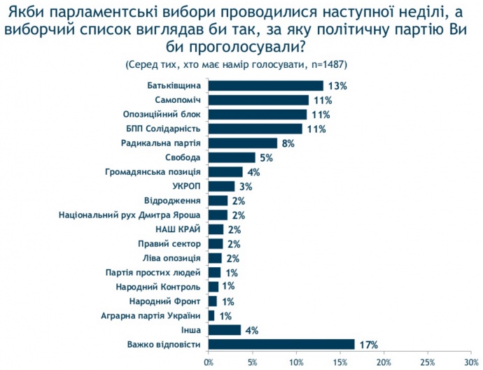 Серед тих людей, які готові піти на виборчі дільниці, 13% проголосували б за "Батьківщину", 11% – за "Опозиційний блок", по 10% – за партію Саакашвілі і "Самопоміч", 9% – за Блок Петра Порошенка, 7% – за Радикальну партію.